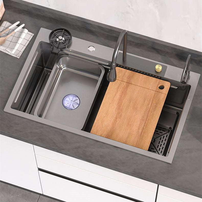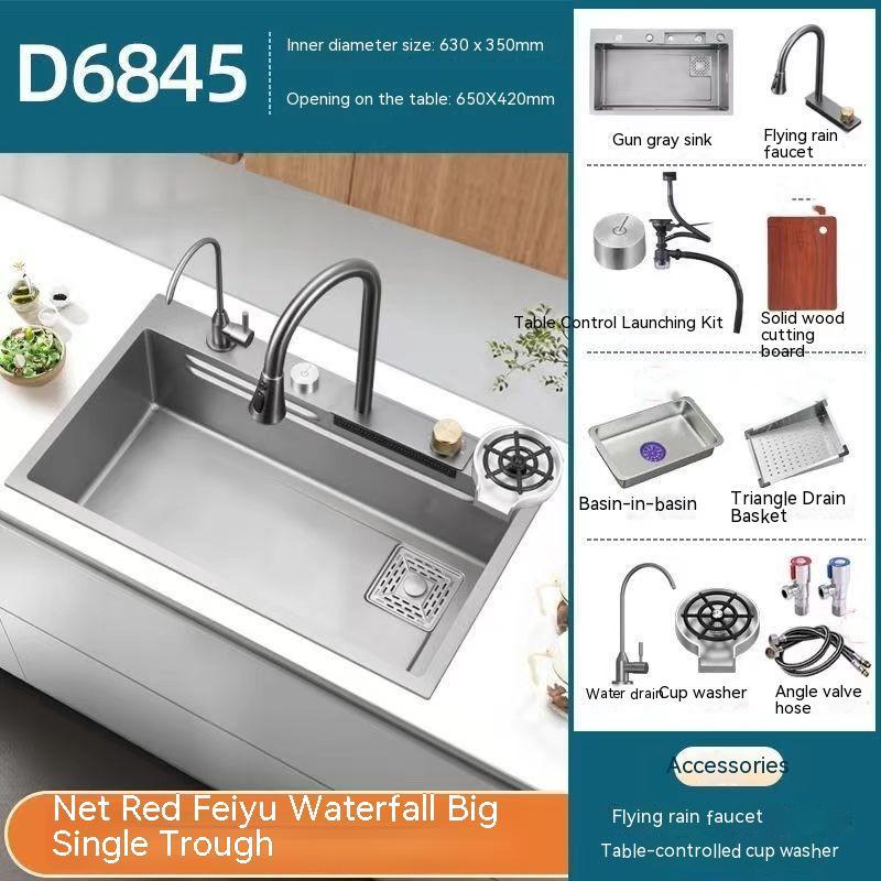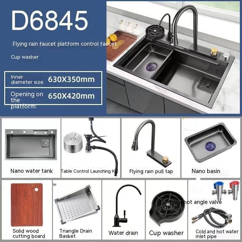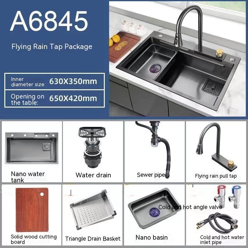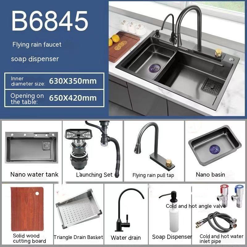 Set1:Basic model ( Sink+Flying rain faucet+Watering set+Solid wood chopping board+Basin in basin+Triangle draining basket+Hot and cold angle valve+Hot and cold hose )