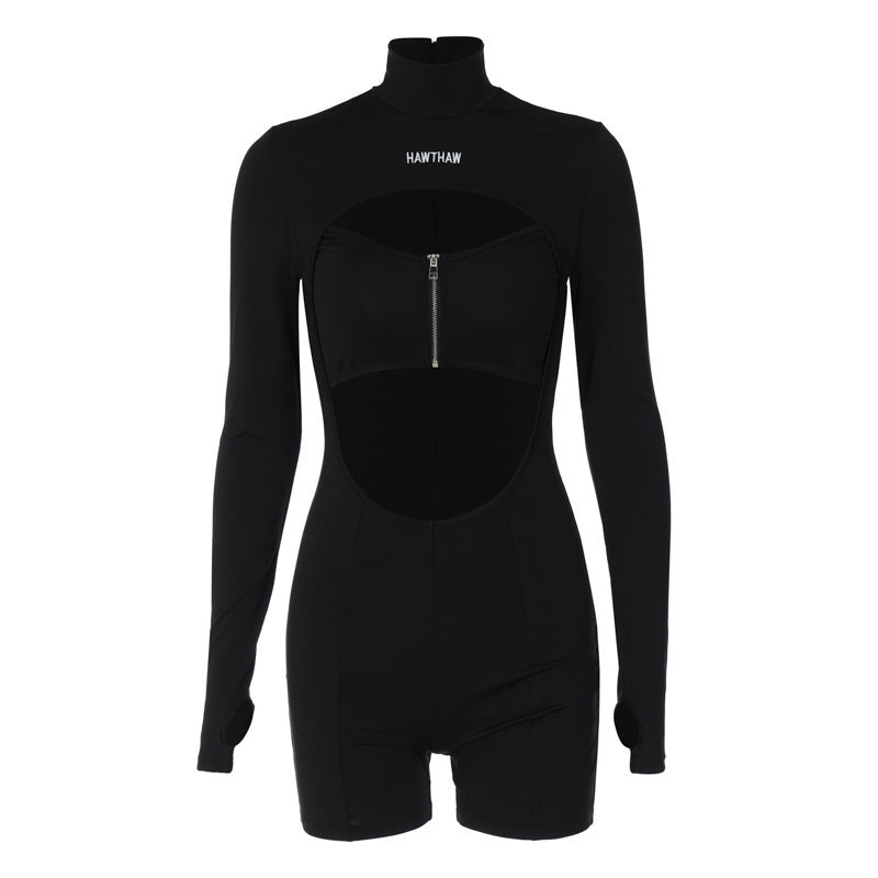 Sexy Cutout Chest Zipper Round Neck Long Sleeve Jumpsuit