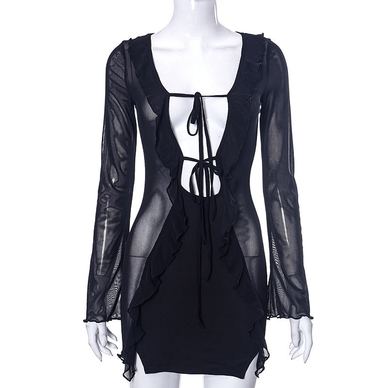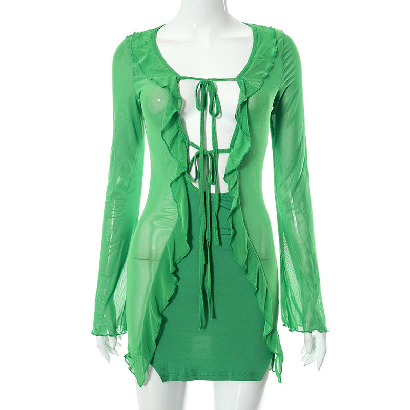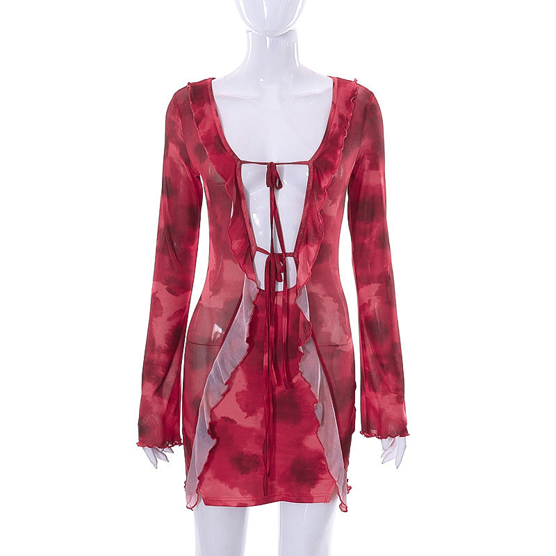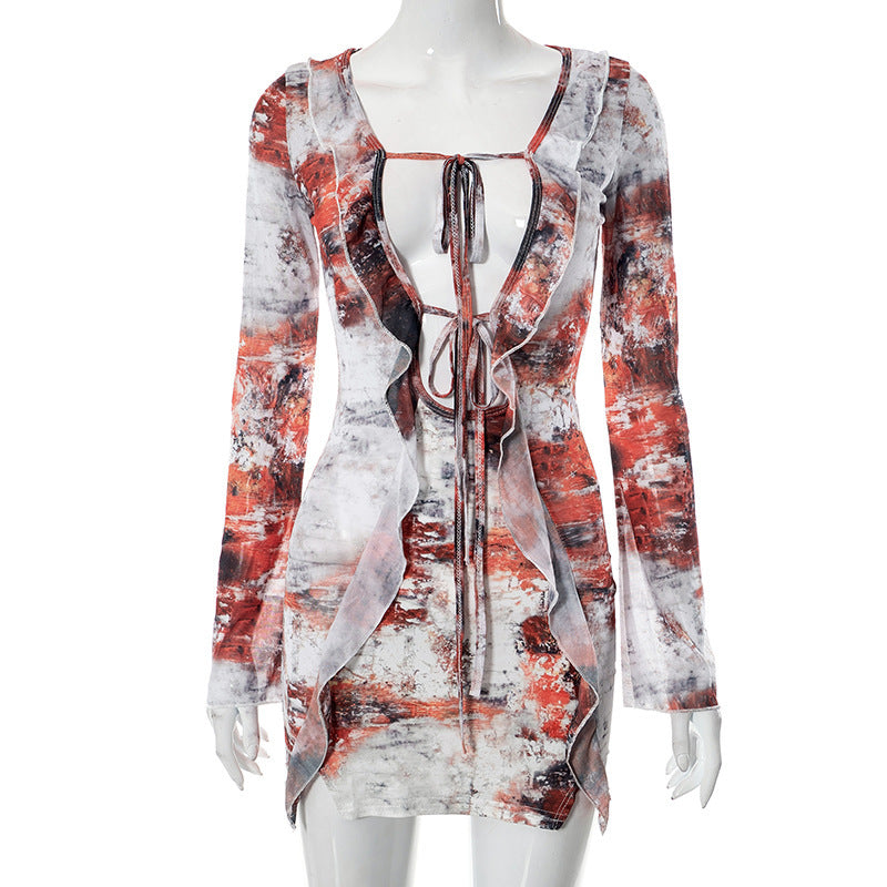 Summer New Printed Mesh Half Sleeve Ruffled Lace-up Short Dress For Women