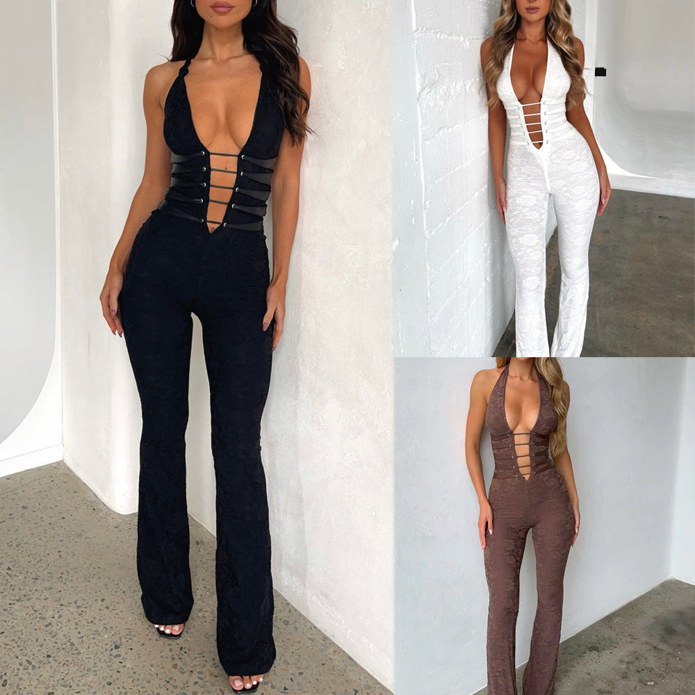 Women's Lace Lash Rope Lace Up Slim Fit Halter Jumpsuit